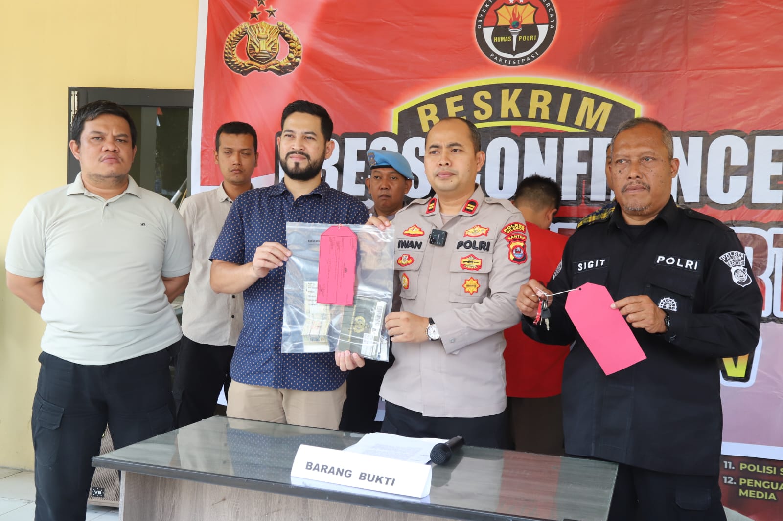 Barang bukti yang diamankan termasuk satu lembar Surat Tanda Nomor Kendaraan (STNK) sepeda motor dan satu buah Bukti Kepemilikan Kendaraan Bermotor (BKPB). Selain itu, satu kotak kunci cadangan asli diambil dari korban, serta satu unit sepeda motor Kawasaki KR150P (Ninja RR) warna merah dengan nomor polisi NRKB A 6949 CV (warna asli hitam dan nomor polisi NRKB A-4815-GT), nomor rangka MH4KR150PDK62634, nomor mesin KR150KEPE1105, tahun 2013, beserta satu kunci kontak asli diperoleh dari seorang saksi.